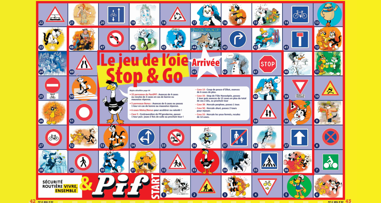Le traditionnel jeu de l’oie se réinvente avec Pif et ses amis grâce à une version éducative et ludique : le Jeu de l’oie Stop & Go. Conçu en partenariat avec la Prévention routière, ce jeu permet aux enfants (et aux plus grands !) de se familiariser avec les règles de circulation tout en partageant un moment convivial.