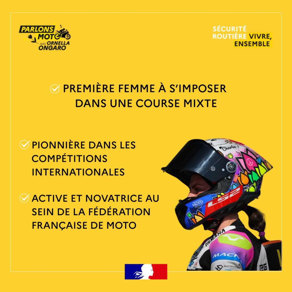 Ornella : Voilà, tout à fait. C’est ça, mais en moto. J’ai aussi été la première à être championne de France, vice-championne de France, championne régionale.