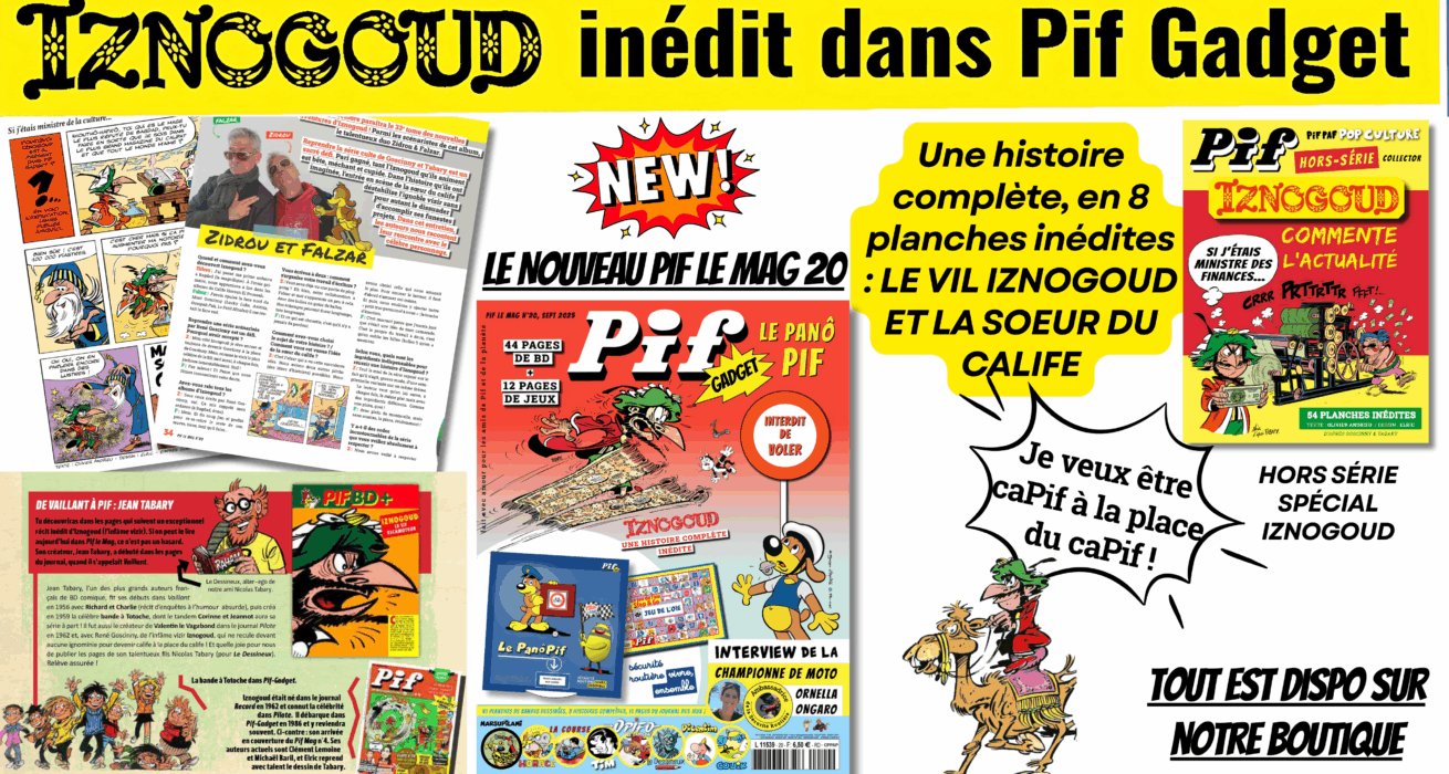 L’infâme Iznogoud envahit régulièrement les colonnes de ton Magazine préféré depuis 5 ans. Retrouve-le dans ton Pif gadget n°20 de septembre 2025, avec une histoire inédite, 8 planches en avant-première de l’album, qui sort le 30 octobre. Cette exclusivité te permettra de découvrir une interview passionnante de 2 nouveaux auteurs à qui l’on doit la rencontre d’Iznogoud avec la soeur du calife.