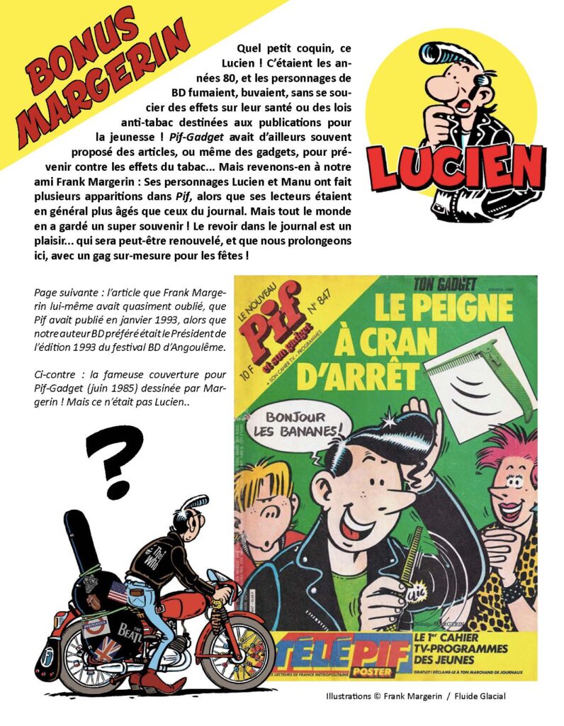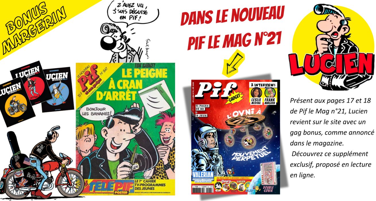 Dans Pif le Mag n°21, Lucien, le personnage emblématique créé par Margerin, est à l’honneur aux pages 17 et 18 du magazine papier.